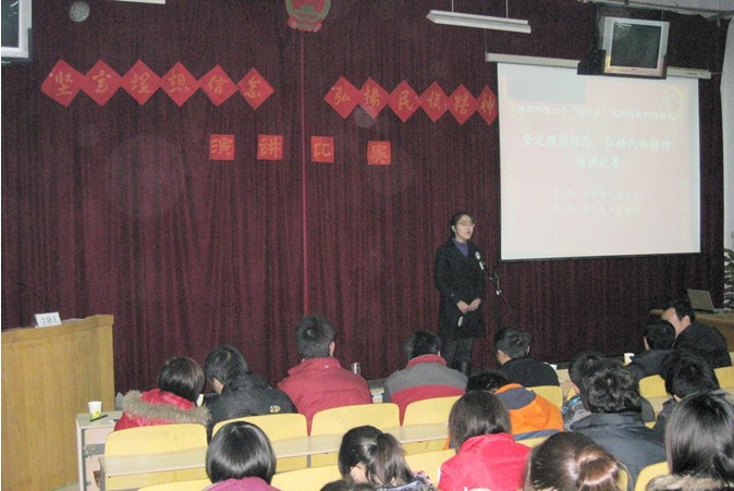 为切实加强和改进大学生思想政治教育,引导广大青年学生深入学习《六个“为什么”》,并针对当前其思想中存在的各种思想矛盾、热点话题和疑点困惑展开讨论,按照法政学院六个“为什么”大家谈系列活动的计划和安排,12月24日晚,万象城“坚定理想信念 弘扬民族精神”演讲比赛在A合九隆重举行。法政学院党总支副书记程曾强老师、团总支书记崔越老师、教学秘书吕刚老师、团总支副书记黄春建老师、09级辅导员许建峰老师、法政学院漆彦忠老师以及团总支、学生会主要学生干部担任了此次比赛的评委。